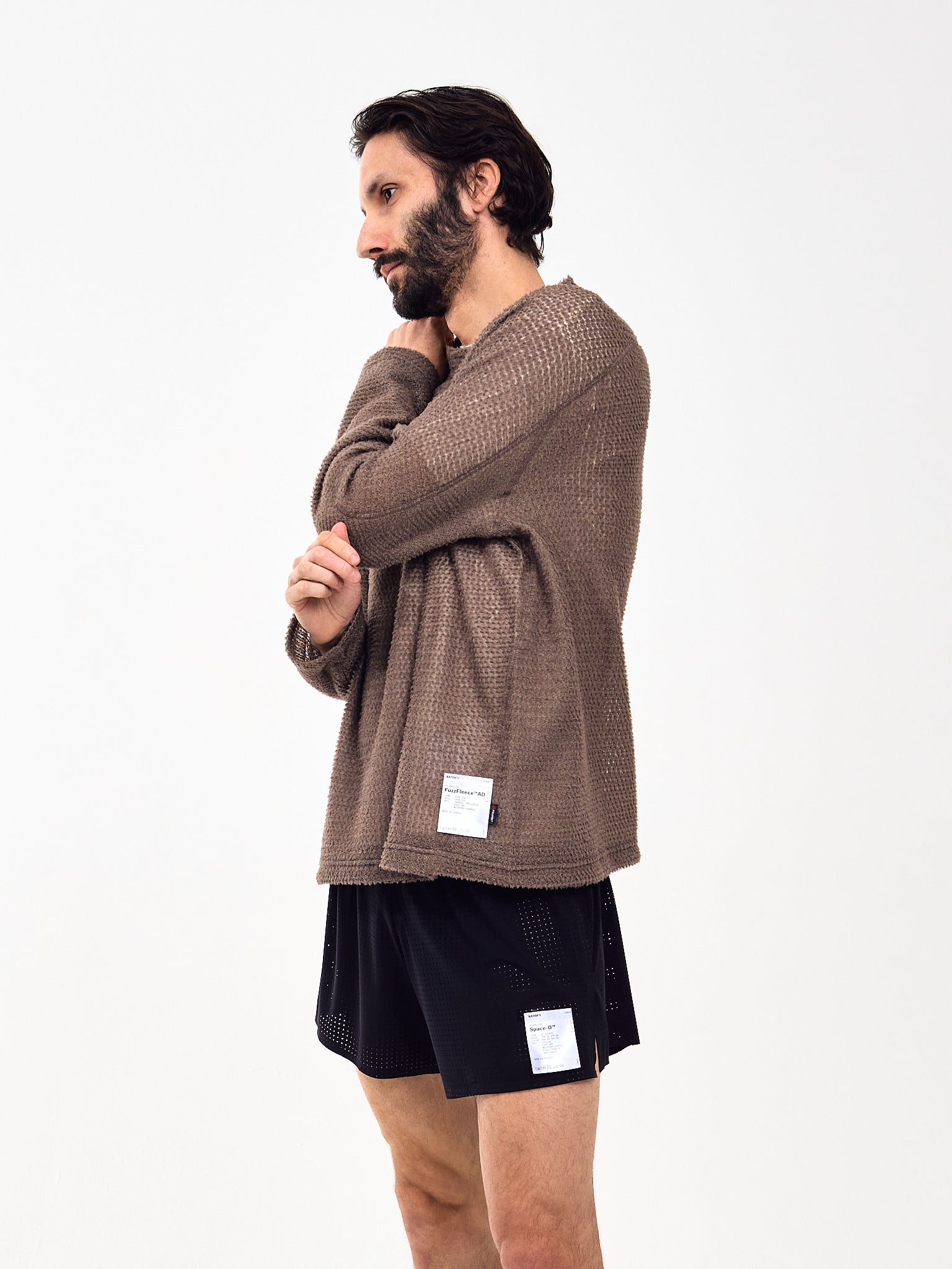 This fleece mid-layer from Satisfy is made from an open-weave fabric that was developed specifically for allowing for air flow whilst also retaining heat close to the body. Ideal for trail running or for those particularly cold days. It can also be worn casually pre-run or post-run to keep you warm. The fit is loose through the body with a cropped hem that allows freedom of movement and encourage good ventilation.