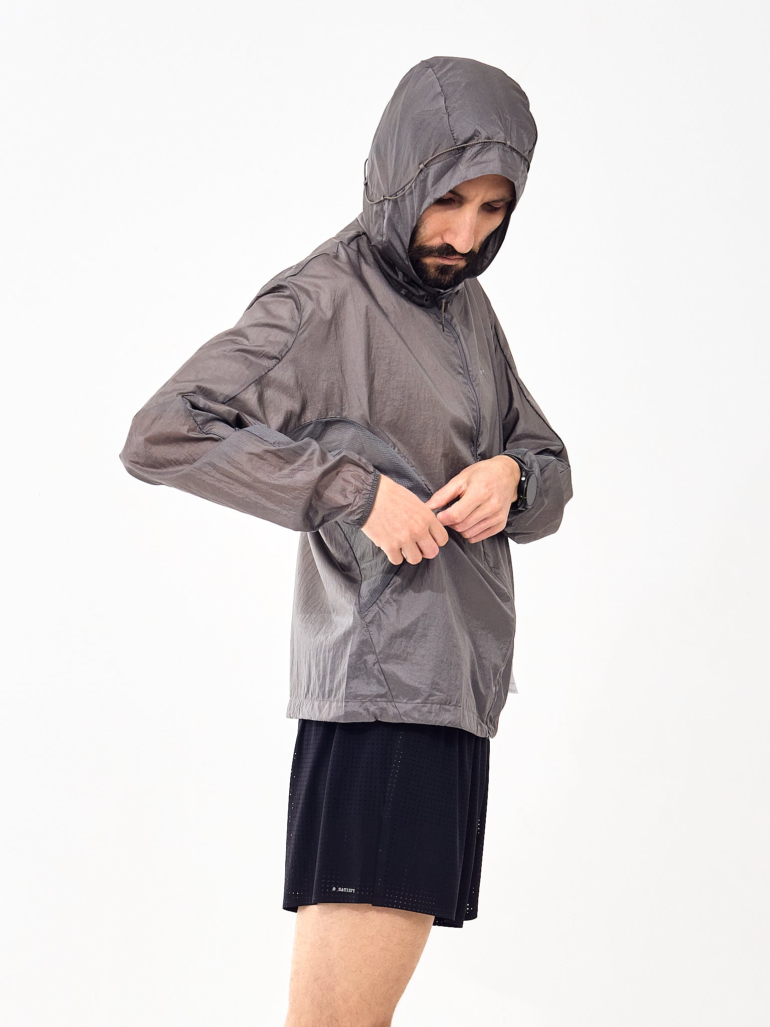 Using lightweight Pertex fabric, this Diamond Windbreaker from Satisfy is great for packing for the wet, windy weather. It gets its name from the interlocking diamond-shaped filaments that are woven together. This creates an abrasion resistant fabric that is also water-repellent. Under the arms are ripstop panels that are breathable and lighter-weight than the rest of the shell, allowing for better airflow when moving. The hood has some really interesting exterior drawcords that are used the create a tight fit around the head when the wind is blowing against you.